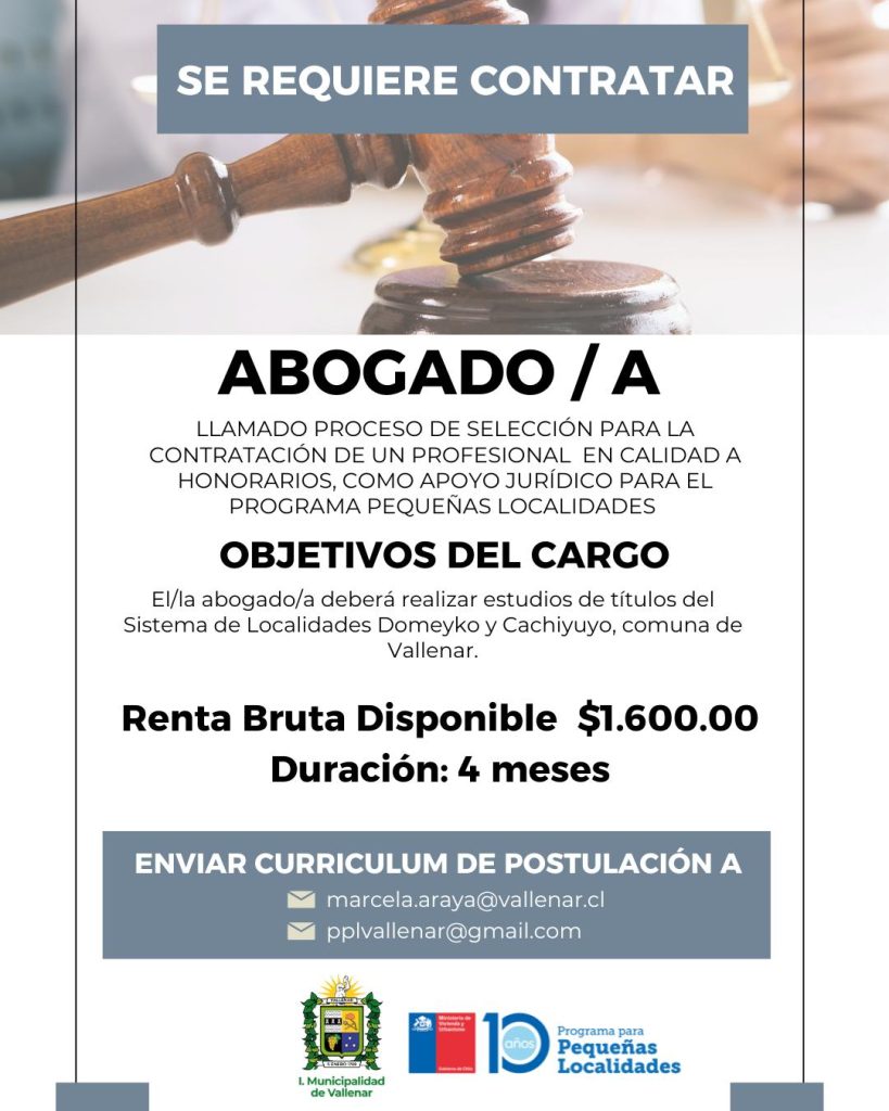 La Ilustre Municipalidad de Vallenar informa la apertura del proceso de selección para la contratación de un/a abogado/a, en calidad de honorarios, como apoyo jurídico para el Programa Pequeñas Localidades.